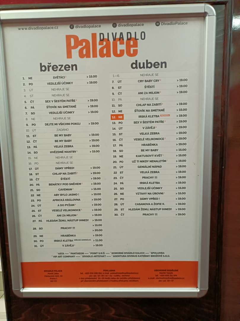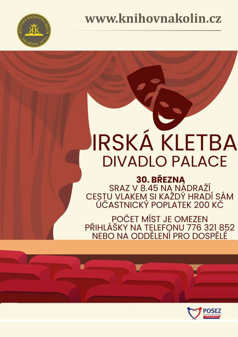 Pojeďte s námi na divadelní představení Irská kletba. Sraz na nádraží v 8.45. Cestu si každý hradí sám. Počřet míst je omezen, přihlášky na telefonu 776 321 852.