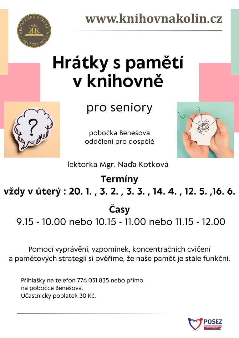 Pomocí vyprávění, vzpomínek, koncentračních cvičení a paměťových strategií si ověříme, že naše paměť je stále funkční. Lektorka Mgr. Naďa Kotková. Přihlásit se můžete na telefonu 776 031 835.