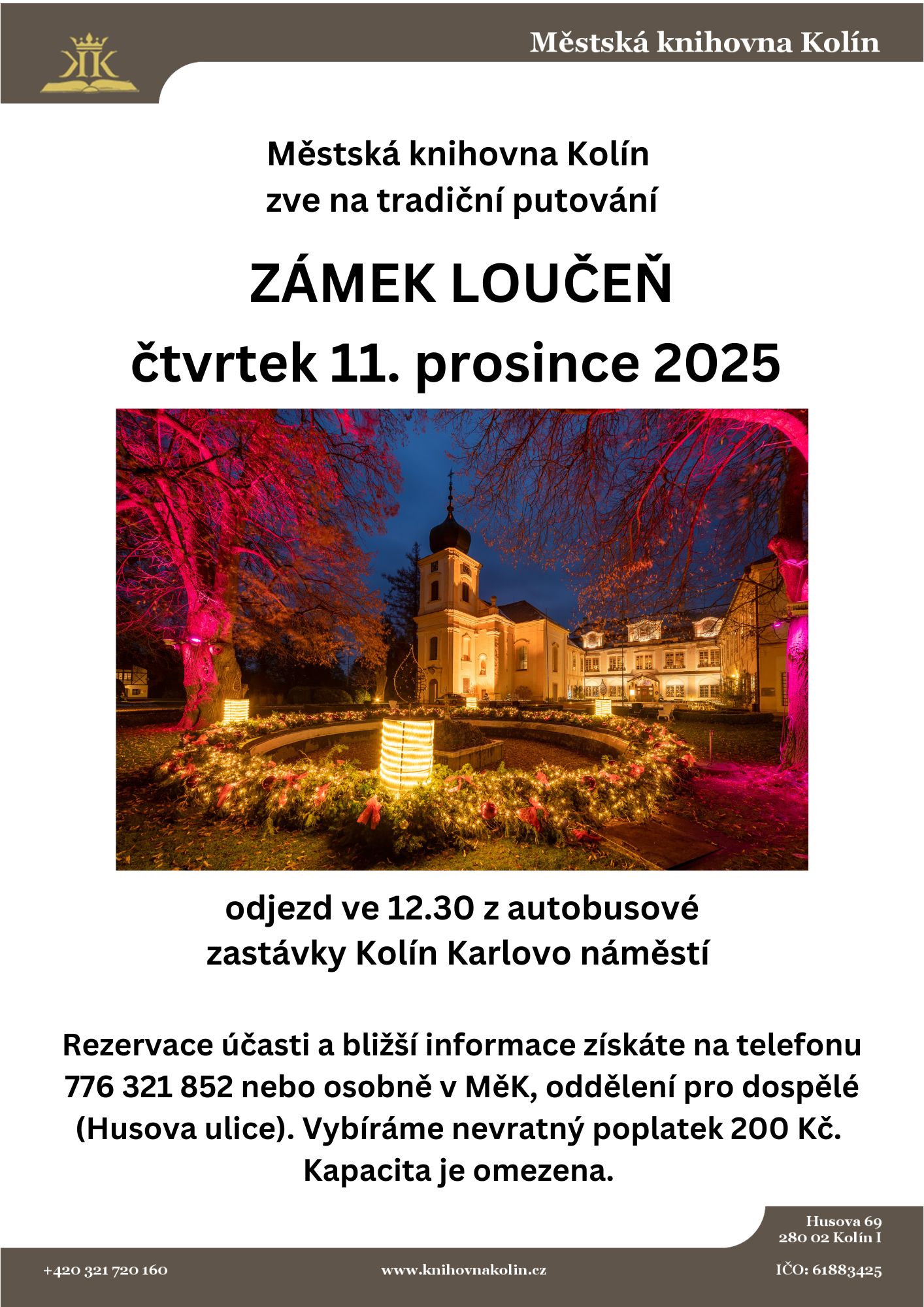 Zveme na tradiční putování. Odjezd ve 12.30 z autobusové zastávky Kolín, Karlovo náměstí. Rezervace účasti a bližší informace na telefonu 776 321 852. Nevratný poplatek 200 Kč. Kapacita je omezena.