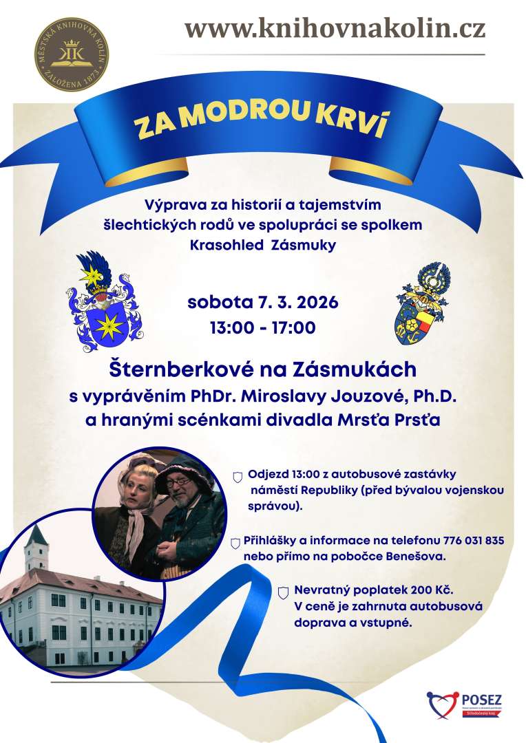 Výprava za historií a tajemstvím šlechtických rodů ve spolupráci se spolkem Krasohled Zásmuky. Vyprávění PhDr. Miroslavy Jouzové, Ph.D. a hranými scénkami divadla Mrsťa Prsťa. Z cyklu “Za modrou krví”. Odjezd ve 13.00 z autobusové zastávky náměstí Republiky (před bývalou vojenskou správou). Počet míst je omezen. Přihlášky na telefonu 776 031 835 nebo přímo na pobočce Benešova.